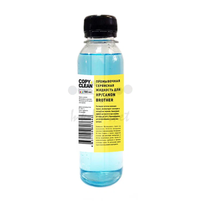 Промывочная сервисная жидкость для HP/Canon/Brothe CopyClean предназначена для промывки печатающих головок принтеров HP/Canon/Brothe при использовании чернил любого типа. В состав жидкости входят растворители, ПАВ, дистиллированная вода, целлозольв, бутанол, МП - данная формула позволяет эффективно растворять без осадка остатки засохших водных чернил, а также диспергировать засохшие пигментные чернила. Описание: прозрачная жидкость слабо голубого цвета, с характерным запахом, средней агрессивности. Обладает хорошими моющими свойствами. Назначение: -промывка внутренних полостей струйных картриджей; -промывка абсорбера (спонжа) струйных картриджей; -промывка каналов печатающих головок; -промывка дюз печатающих головок; -промывка чернильных «трасс» и чернильных помп струйных принтеров; -промывка места парковки (капы) головки струйного принтера