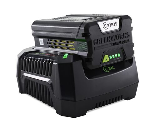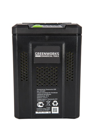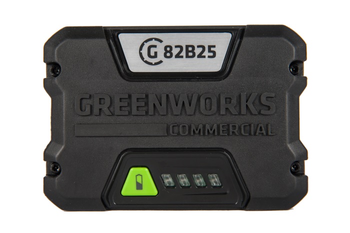 Аккумуляторная батарея Greenworks GC82B25. Это литий-ионная (Li-ion) батарея последнего поколения. Выполненная по новейшей технологии и используемая в технике Greenworks серии 82V Commerc. Батарея состоит из ячеек LG и снабжается встроенным электронным чипом. Чип предназначен для защиты от перезаряда, перегрева и глубокого разряда. 2000 циклов заряда-разряда гарантируют долгий срок службы. При коммерческом использовании равно приблизительно 8-ми годам работы. Литий-ионная (Li-ion) батарея не подвержена «эффекту памяти» — потери ёмкости при подзарядке не полностью разрядившейся батареи.