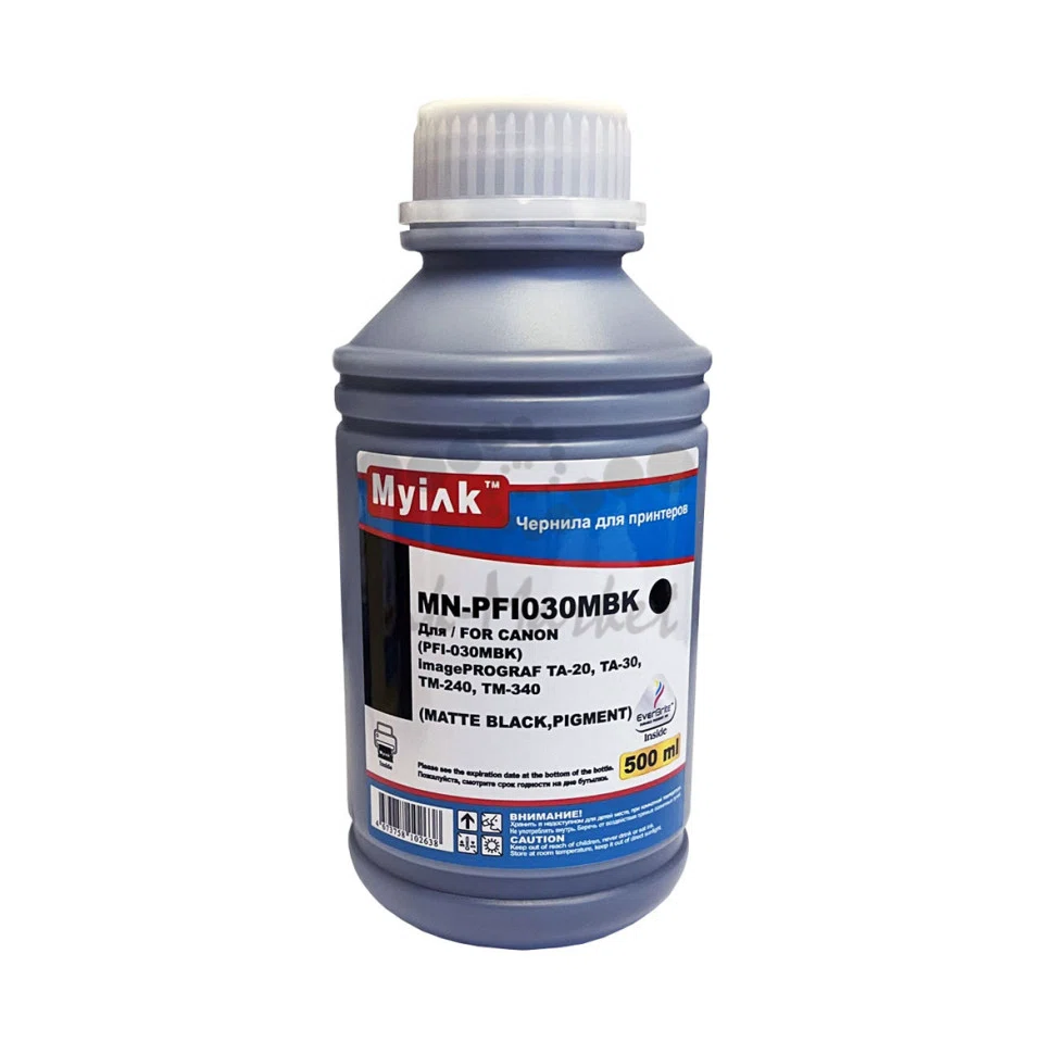 Чернила для CANON imagePROGRAF TM-240/TM-340 (PFI030MBK), 500 мл, Matte Black, Pigment, MyInk Откройте для себя премиальное качество печати с чернилами MyInk! Созданные специально для принтеров CANON imagePROGRAF TM-240/TM-340, эти чернила обеспечивают глубокий и насыщенный чёрный цвет. Благодаря высокой концентрации пигмента, чернила Matte Black гарантируют чёткость и яркость каждой детали вашего отпечатка. Их объём в 500 мл позволит вам печатать множество документов и изображений без необходимости частой дозаправки. Выбирая чернила MyInk, вы выбираете безупречное качество и надёжность. Сделайте ваш принтер CANON imagePROGRAF TM-240/TM-340 ещё более мощным с помощью премиальных чернил MyInk! Совместимые модели принтеров: Canon imagePROGRAF TA-20, TA-30,TM-240,TM-340 Canon imagePROGRAF TM-200, TM-205, TM-300, TM-305, TM-250, TM-255, TM-350, TM-355, TX-4100, TX-3100, TX-2100, TX-2000, TX-3000, TX-4000 Совместимые модели картриджей: PFI-030MBK PFI-121, PFI-321, PFI-031 PFI-120, PFI-320