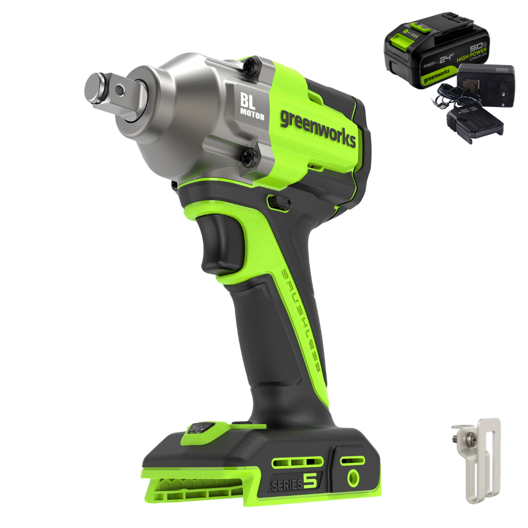Аккумуляторный ударный гайковерт Greenworks 24В IW5500K5 (арт.3805007CUG) — компактный, производительный и мощный инструмент. Создан для работ по заворачиванию и отворачиванию резьбового крепежа (гайки, болты), а также для работ с метизами (винты, саморезы, шурупы) в гараже, в мастерской или на строительной площадке.