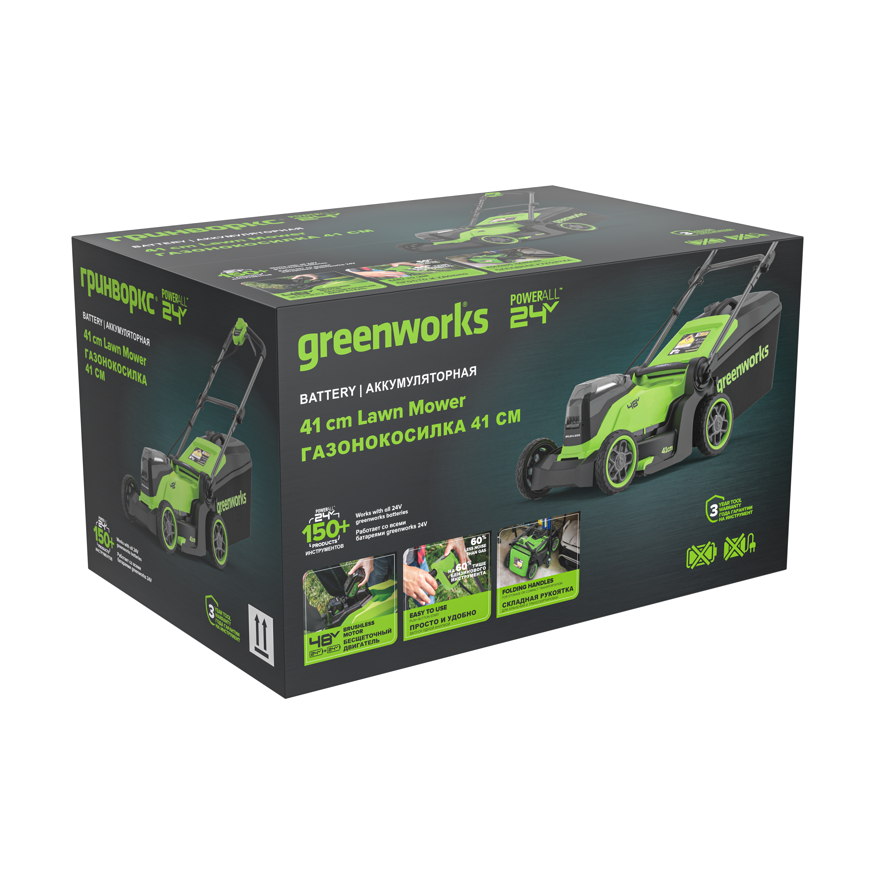 Аккумуляторная газонокосилка Greenworks 24В GD24X2LM411 работает от аккумуляторов 24V совместимых c 70 инструментами для сада, дома и мастерской из линейки Greenworks 24V.