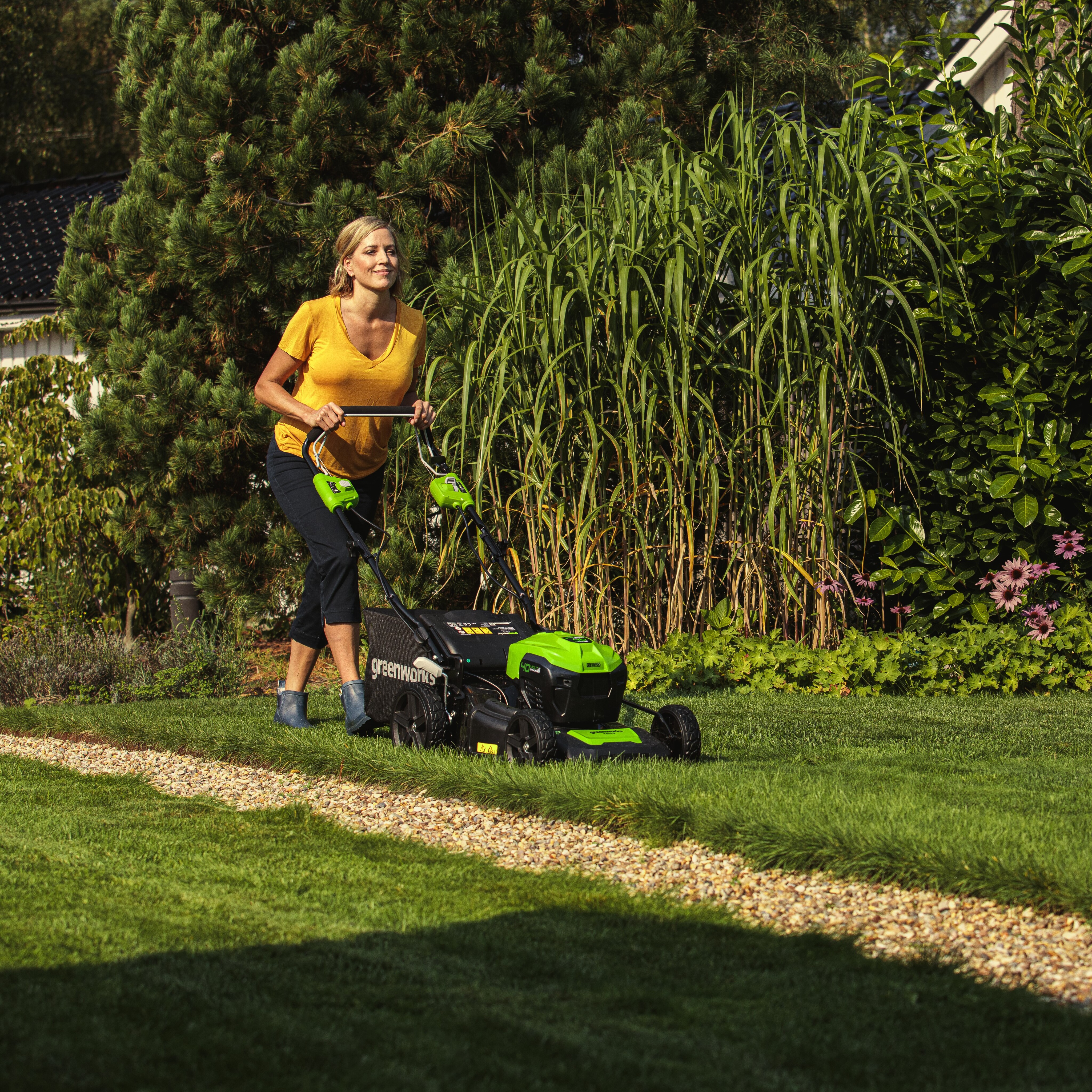 Аккумуляторная газонокосилка Greenworks 40В GD40LM46SPK5 работает на аккумуляторах серии Greenworks 40В, что упрощает работу с несколькими инструментами, сохраняя единое решение по питанию.