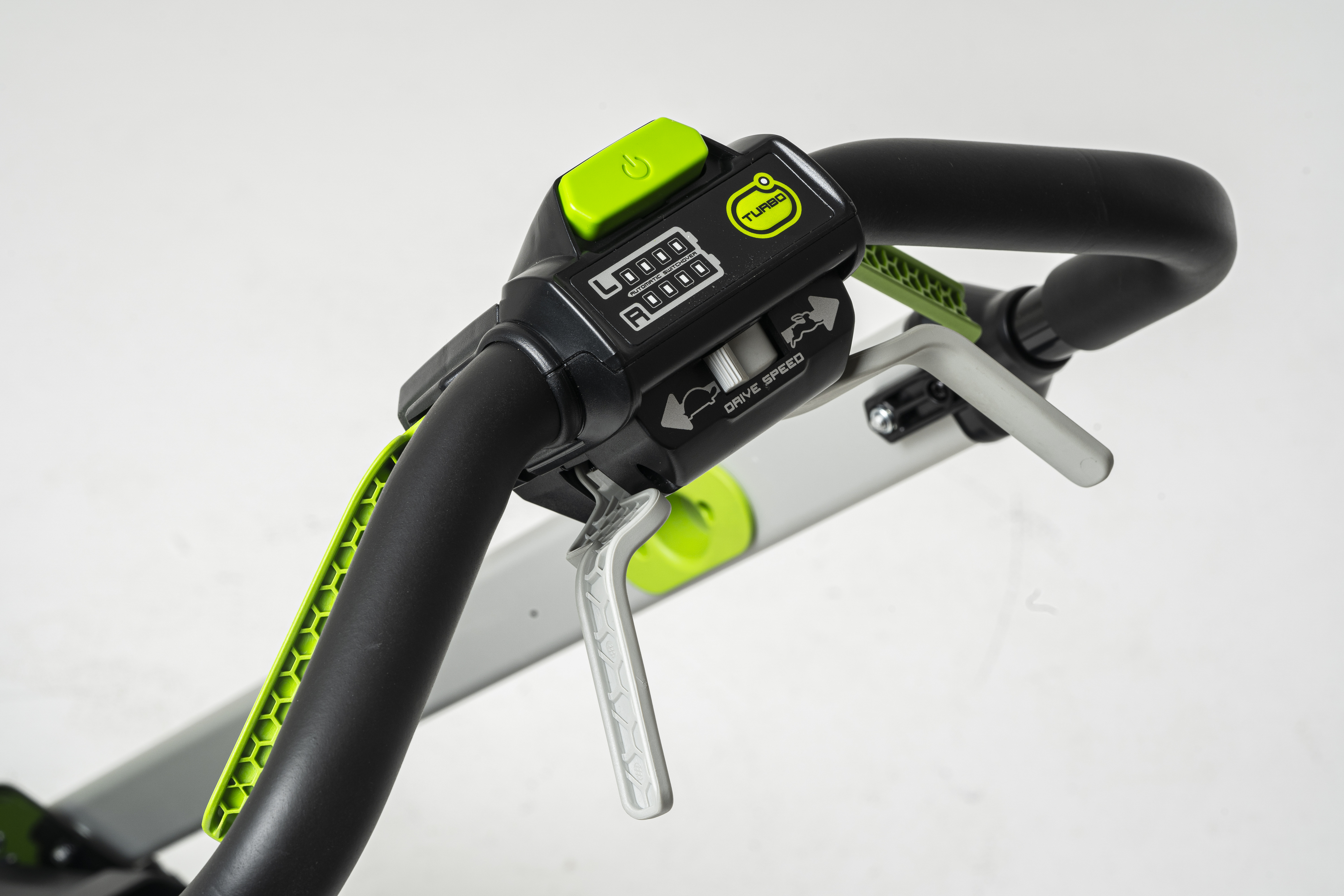 При работе на участке с густой травой, Вы можете нажать клавишу Turbo на рукояти газонокосилки. При нажатии и удержании клавиши обороты двигателя повышаются до 3100 оборотов в минуту, что позволяет выкосить особенно сложные участки. Обратите внимание, что использование Turbo, приводит к повышенному потреблению энергии аккумулятора.