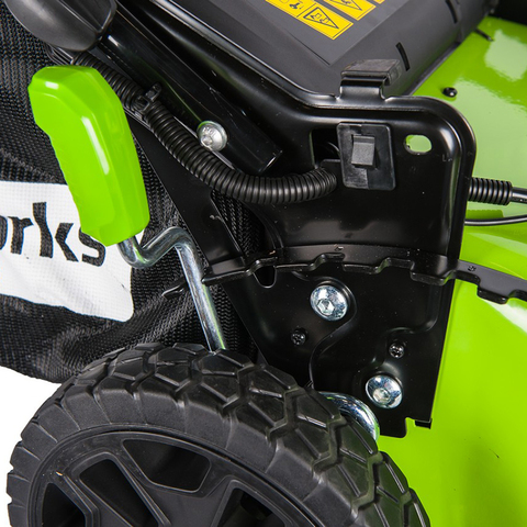 Регулировка высоты скашивания имеет привод на все 4 колеса одновременно, то есть косилка поднимается параллельно земле. Диапазон регулировки имеет 7 уровней: от 25 мм до 80 мм. Для долговечной службы газонокосилка оснащена предохранителем двигателя от механических повреждений при столкновении с твердыми предметами. Максимальное время автономной работы составляет 60 минут от 4 А/ч батареи или до 600 м². Косилка оснащается ключом безопасности для предотвращения случайных запусков. Ручка имеет складной механизм для экономии места при хранении.