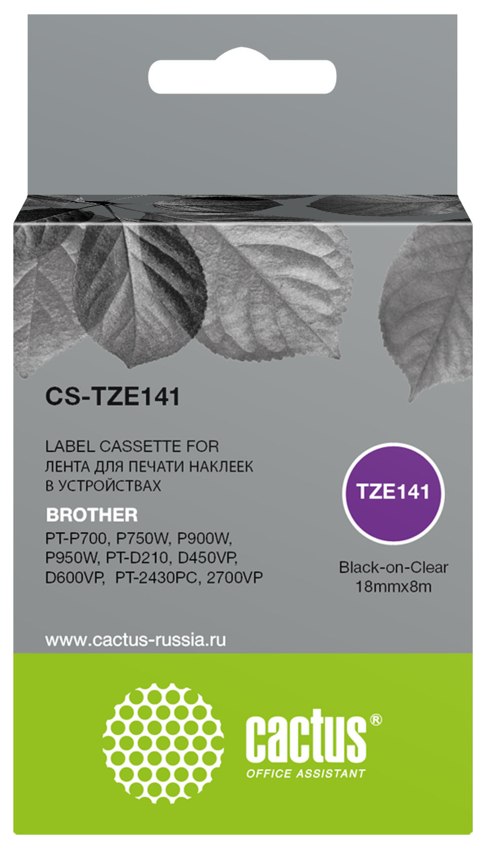Картридж ленточный Cactus CS-TZE141: черный текст на прозрачном фоне, ширина ленты 18 мм, длина 8 м. Ламинированная лента для печати наклеек подходит для маркировки любых предметов, от кабеля, трубопровода и оборудования, до папок и полок. Наклейки обладают хорошей устойчивостью к экстремальным температурам, трению, воздействию химикатов и солнечного света. Можно использовать на открытом воздухе.