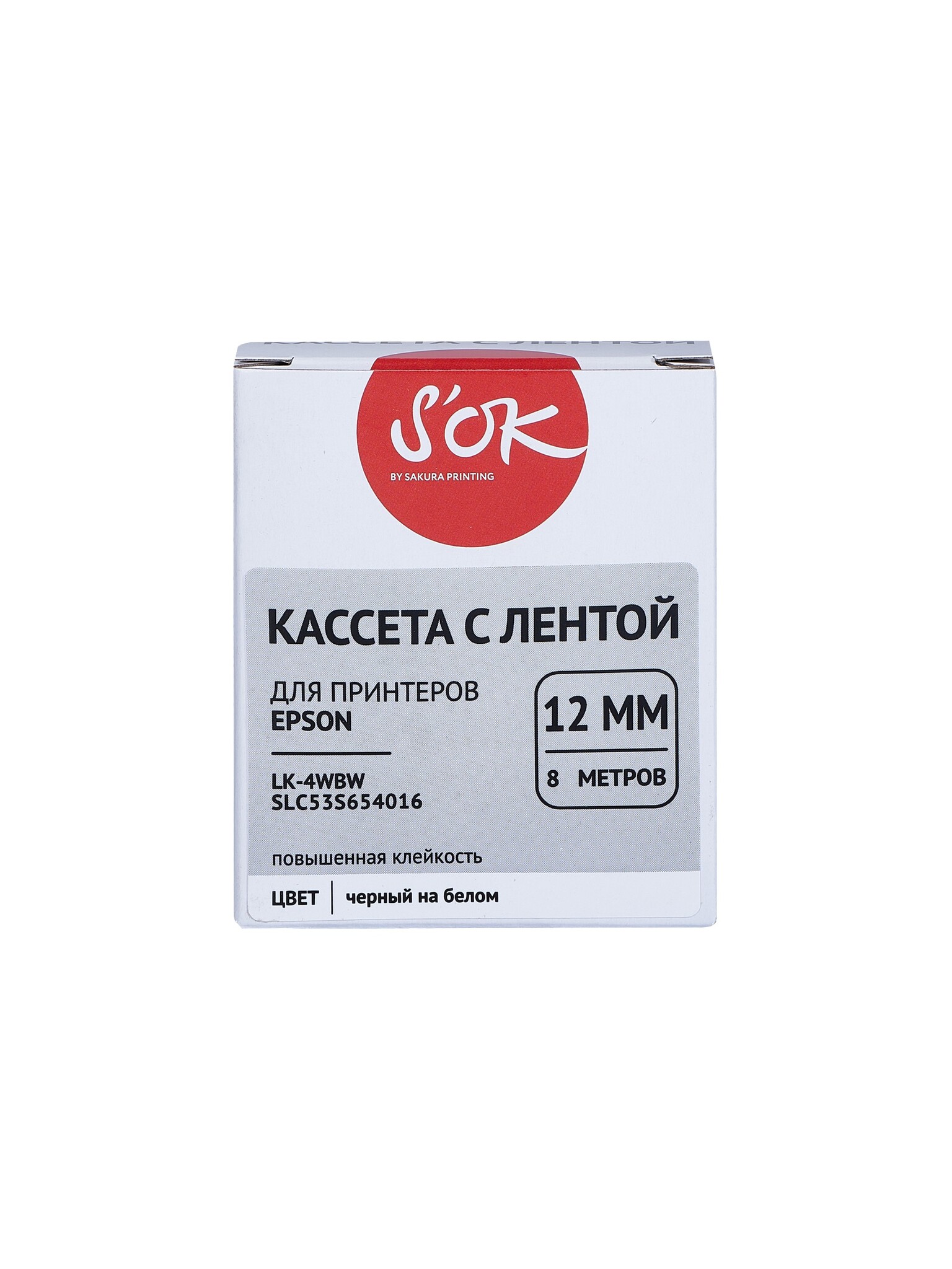 Кассета с лентой S'OK by Sakura Printing C53S654016 (LK4WBW) для Epson LW300, LW400, LW700, LW600P, LW1000P, K400, Z700, Z800, черный на белом, 12мм, 8м, повышенная клейкость