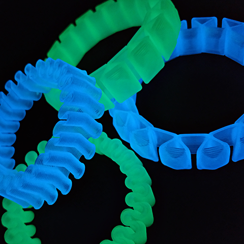 Данный пластик содержит люминофор и способен длительное время светиться в темноте после нахождения под дневным или искусственным освещением.