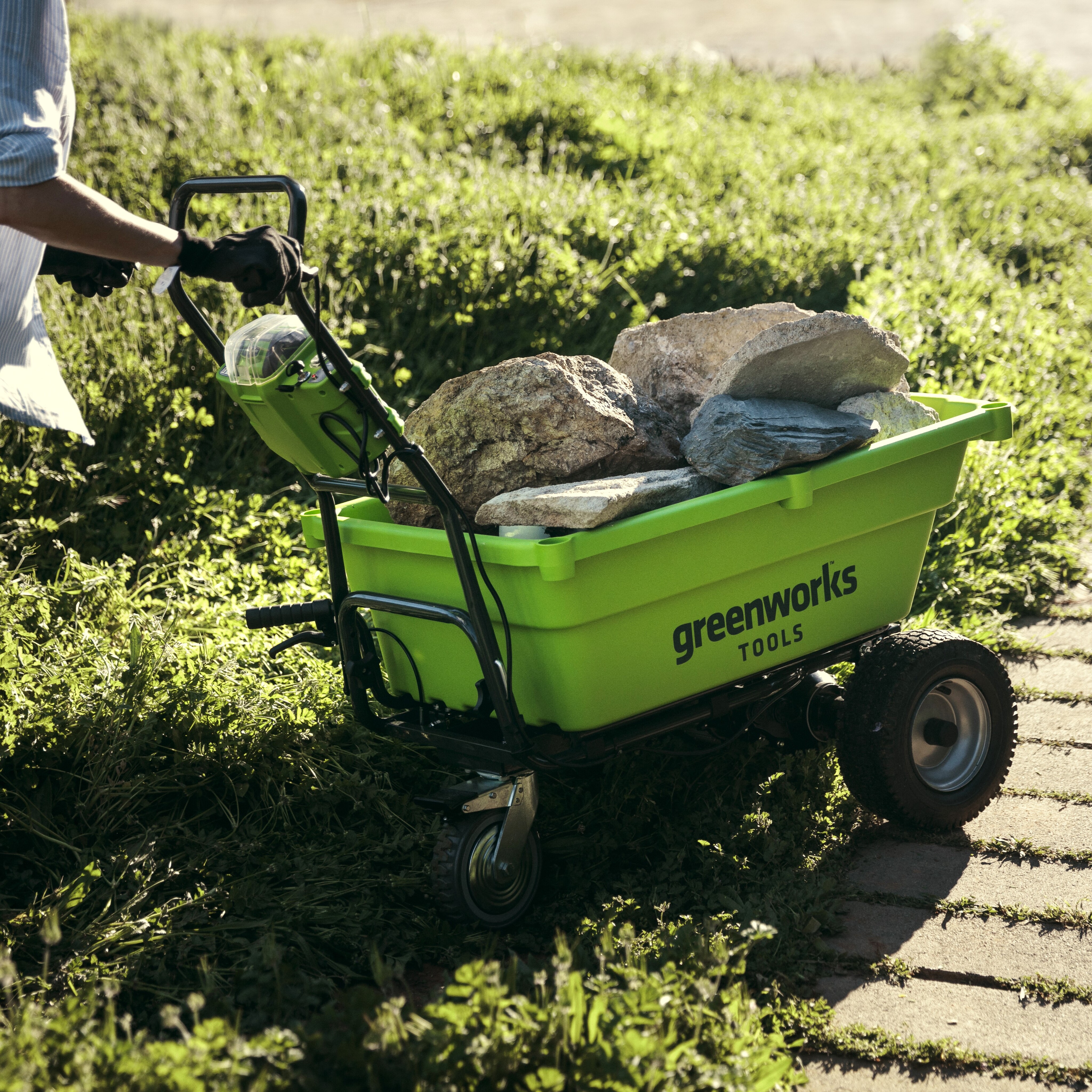 Опорное колесо имеет стояночный тормоз. Время работы до 45 минут от 4 А/ч аккумулятора, а максимальный ход до 3 км от 4 А/ч аккумулятора. Вес тележки 35 кг без аккумулятора. Теперь Вам не придётся надрываться и возить садовую тачку с усилиями, вдыхая вредоносные запахи бензинового мотора. Электрическая эра уже наступила! С Greenworks Ваша жизнь становится лучше!