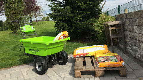 Новинка 2017 года самоходная садовая тележка Greenworks 40V (модель G40GC) мощностью 300 Вт. Новинка модели в России от знаменитого бренда Greenworks. Максимальная нагрузка 100 кг. Объём тележки 106 л. Изменяемые скорости движения: вперёд (высокая) максимальная скорость 4,2 км/ч, вперёд (низкая) максимальная скорость 3 км/ч, задняя максимальная скорость 2,4 км/ч. Предусмотрен механизм подъёма ковша с газовым упором, что позволит без усилий разгрузить садовую тележку.
