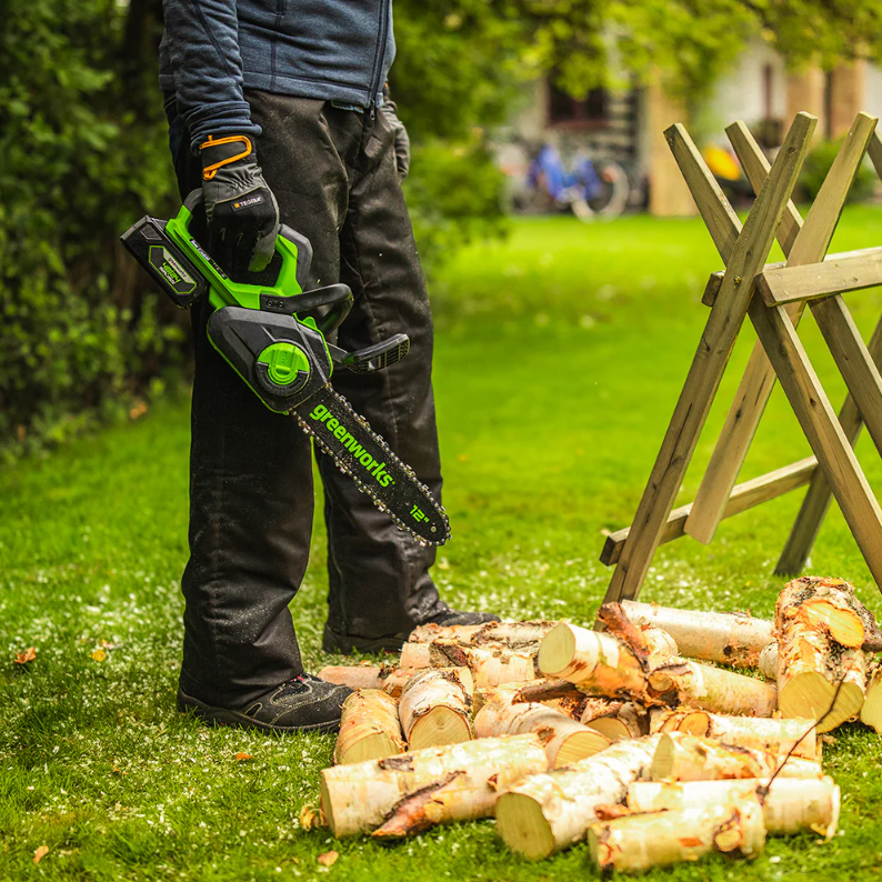 Цепная аккумуляторная пила Greenworks 24В GD24CS30K4 (арт. 2007007UB) — это легкая и компактная пила, идеально подходящая для подрезки кустарников, сучков и даже распиловки небольших бревен. Весом всего 2,6 кг, она удобна в использовании и транспортировке: пила легко помещается в багажник автомобиля или рюкзак, что делает её отличным выбором для любителей природы, рыбалки и охоты. Благодаря питанию от аккумулятора, она полностью автономна и позволяет работать вдали от источников электроэнергии, обеспечивая свободу передвижения и экологичность.