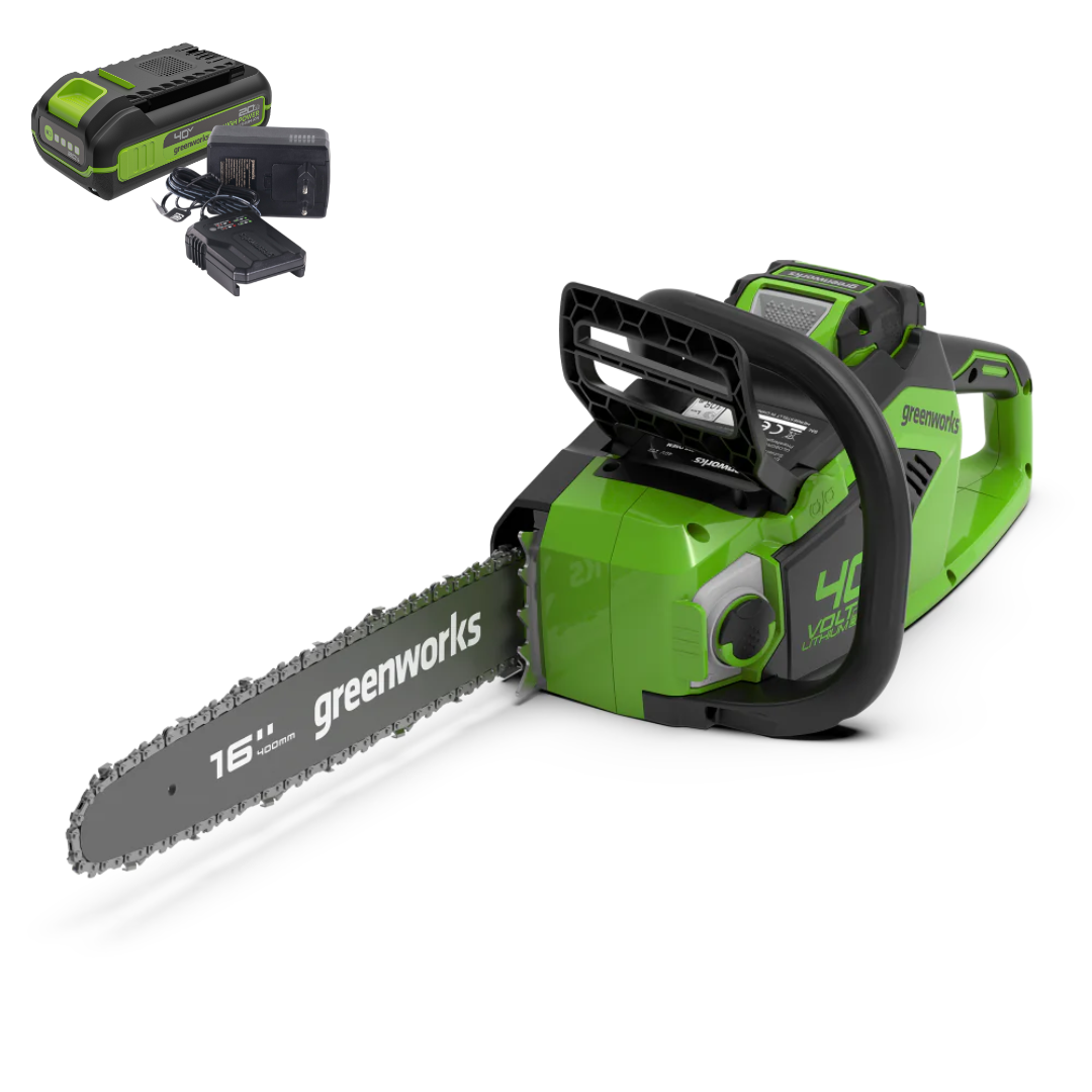 Цепная пила Greenworks 40V GD40CS18K2 работает на аккумуляторах серии Greenworks 40В, что обеспечивает полную совместимость с другими инструментами этой линейки.