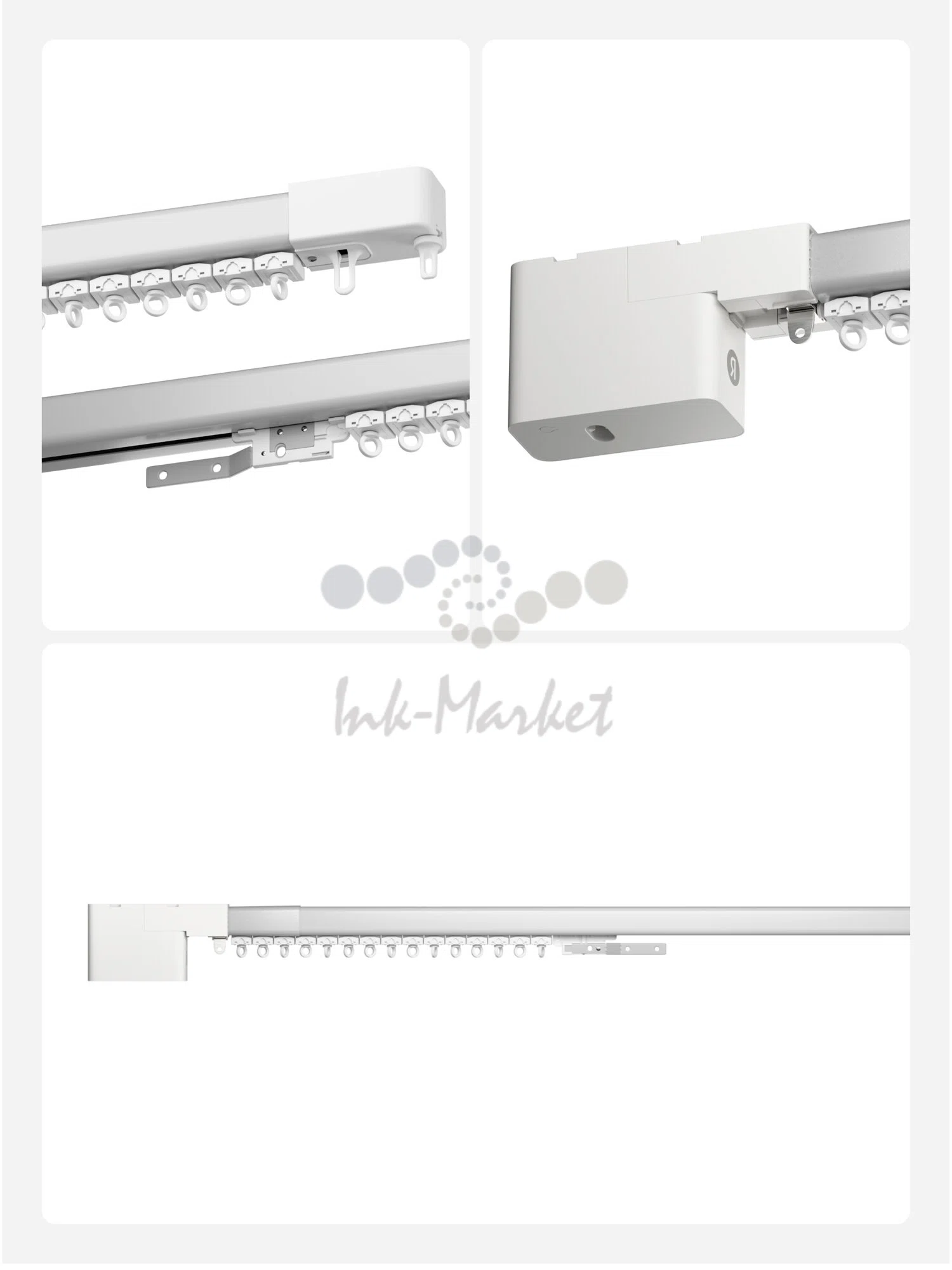 В комплект входят компактный мотор, карниз с регулируемой длиной и специальный набор для его крепления к потолку или к стенам.