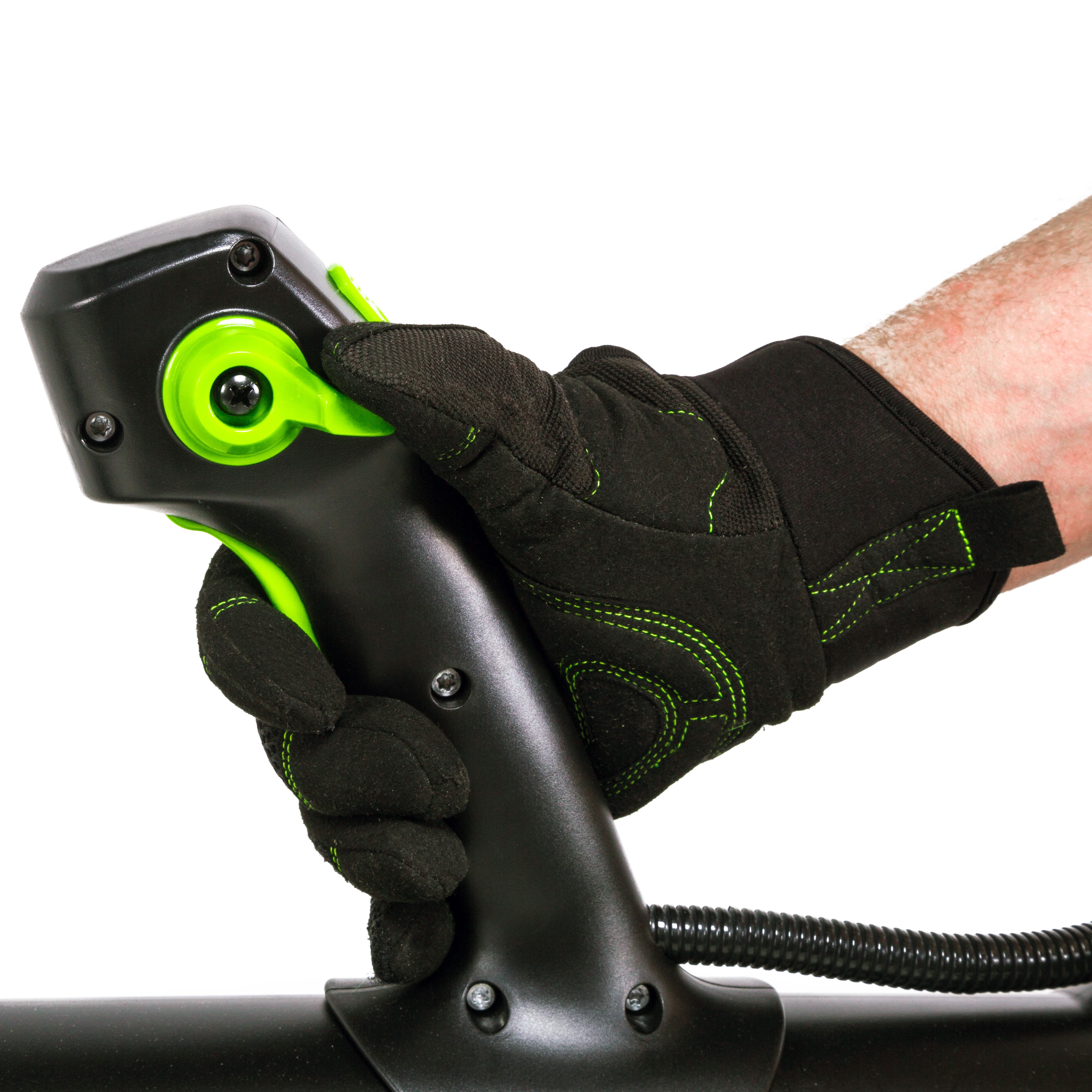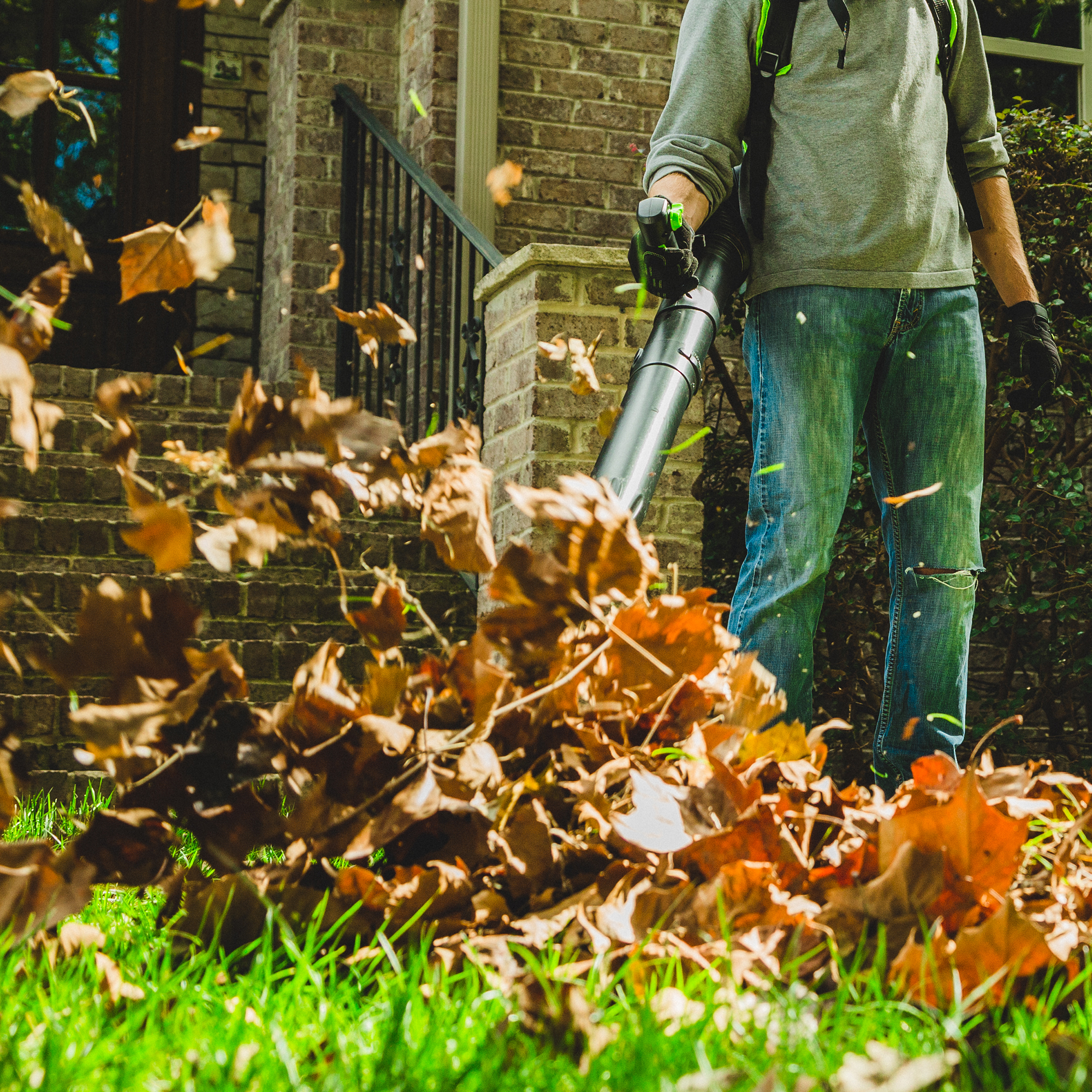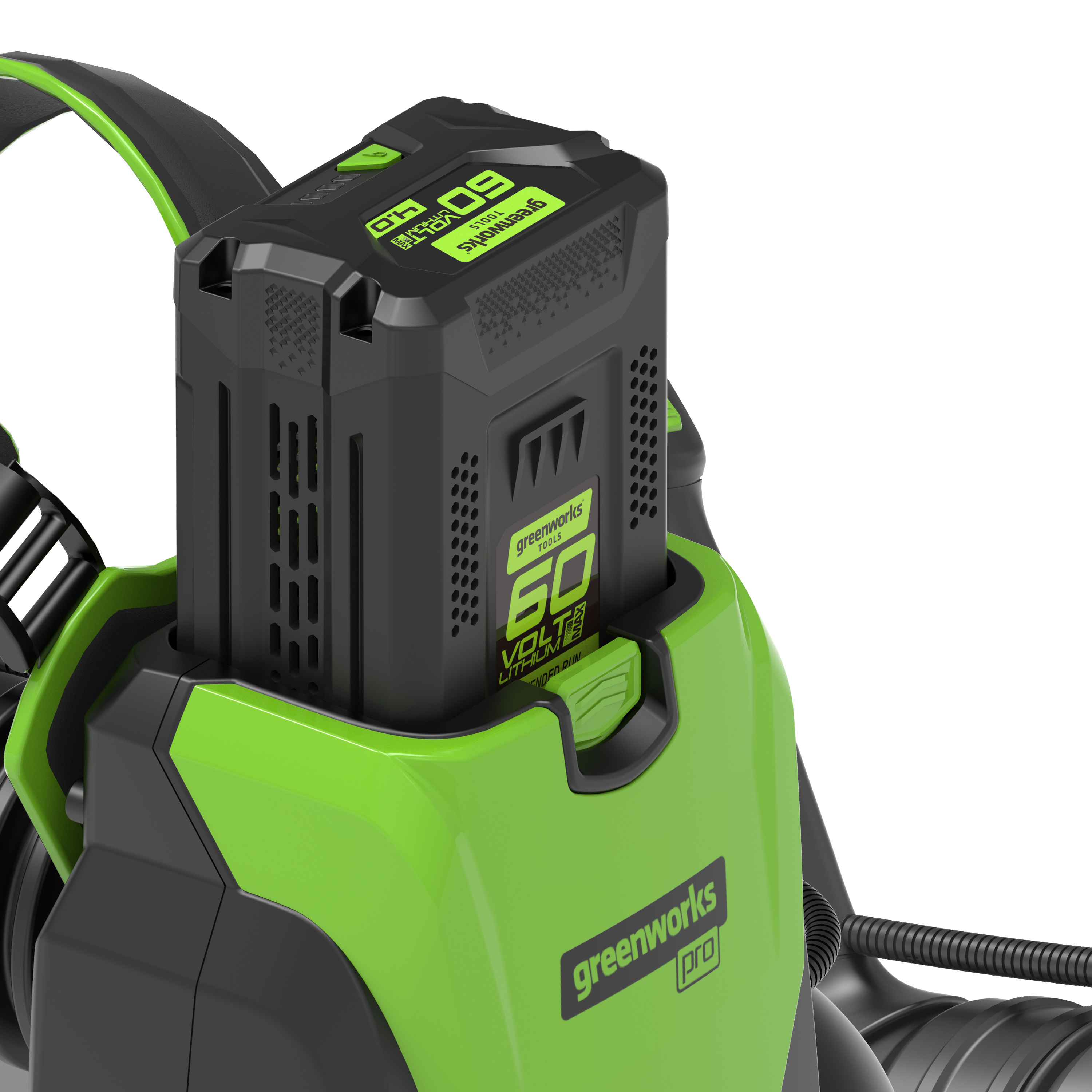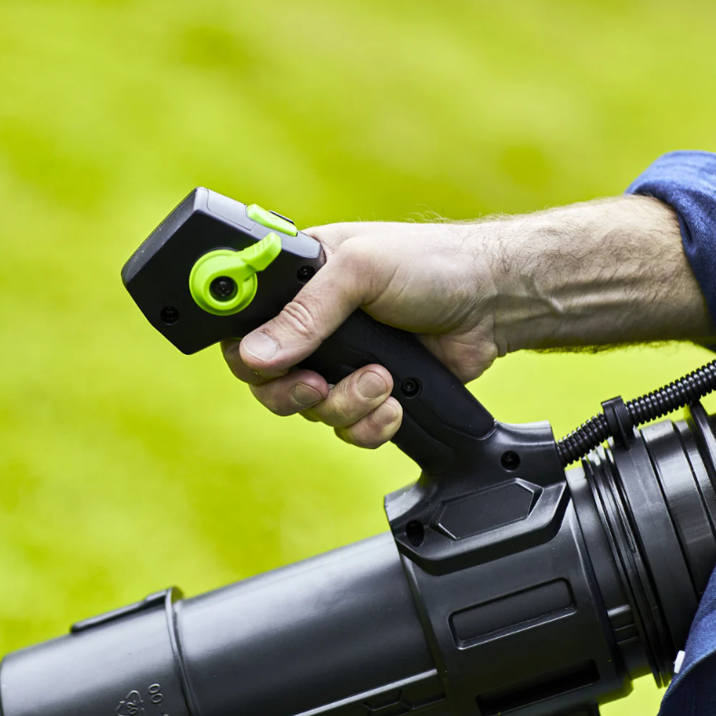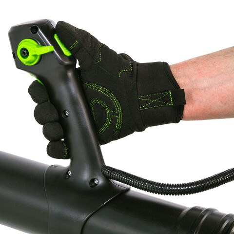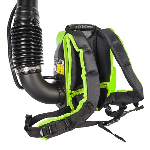 Для долговечной работы двигатель оснащен системой защиты от перегрузок. Модель имеет 2 скорости с плавной регулировкой на курке и с фиксатором, плюс турбо режим. Рукоятка прорезинена, чтобы рука не соскальзывала во время работы. Эта садовая воздуходувка работает от аккумуляторной Li-Ion батареи 60V, которая подходит ко всем устройствам из линейки Гринворкс 60V.