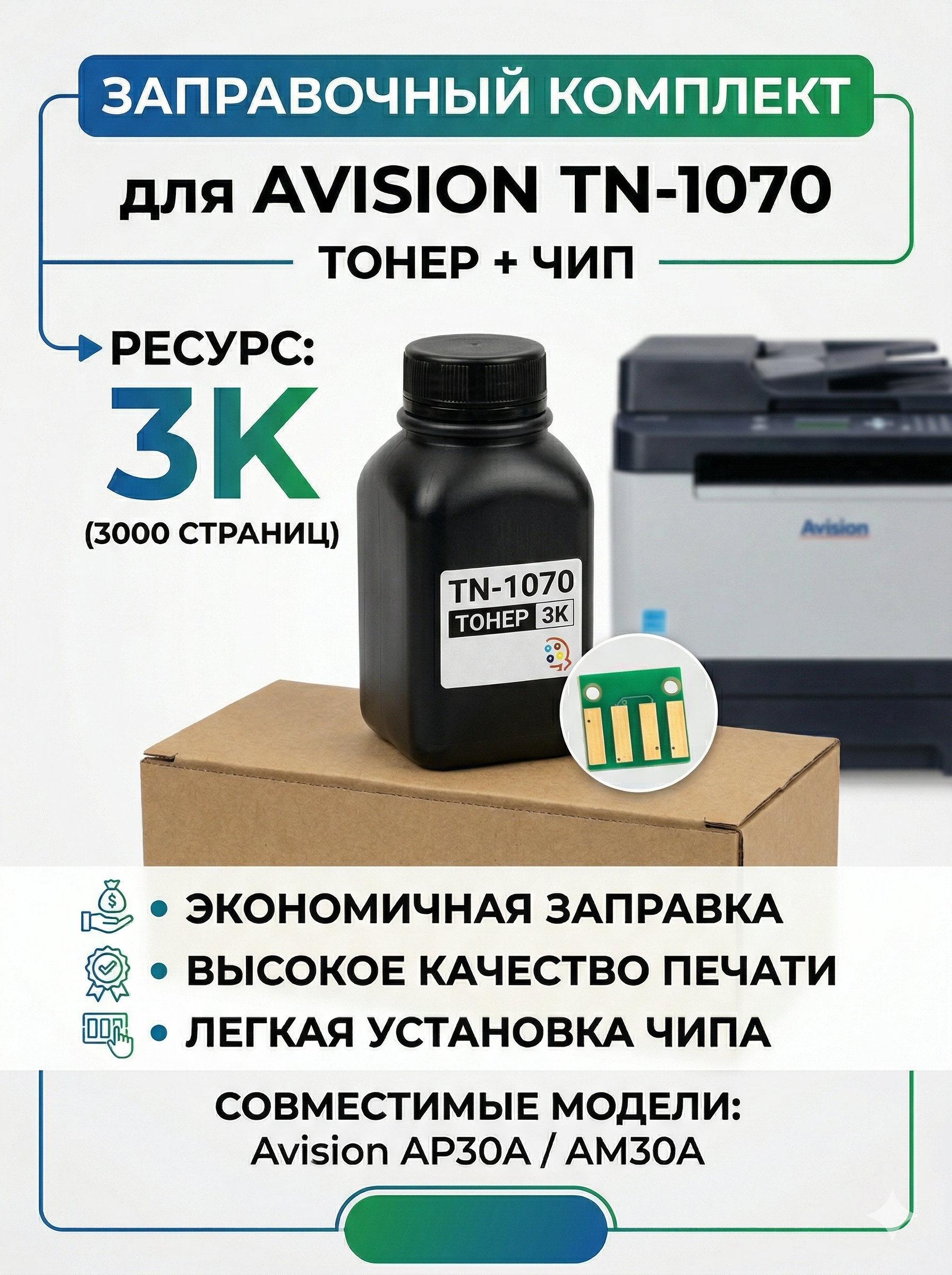 Тонер и чип для заправки картриджей Avision TN-1070 (015-0273-22) для принтеров и мфу Avision AP30, Avision AM30, Avision AM30A
